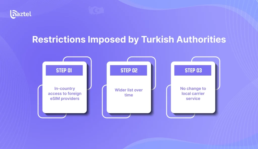 Turkey did not outlaw eSIM. The regulator, BTK, blocked access inside the country to many international eSIM provider websites and apps and expanded after. If you try to open some provider sites on Turkish mobile networks, they may not load.