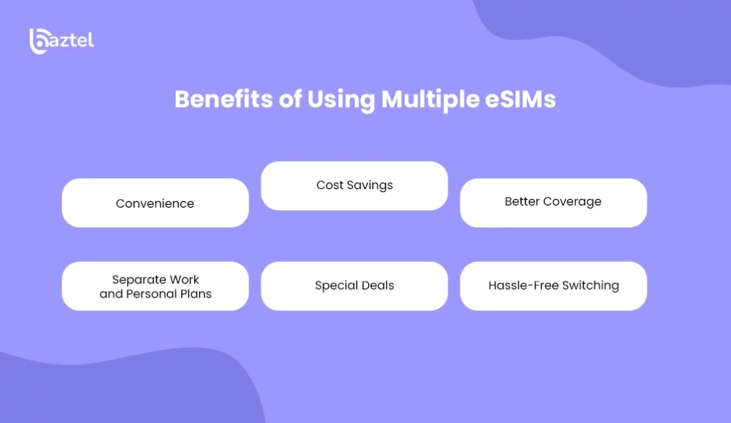 Utilizing several eSIMs (or a single eSIM with multiple profiles) provides additional flexibility and control over your mobile connectivity. Below is an in-depth outline of the benefits: