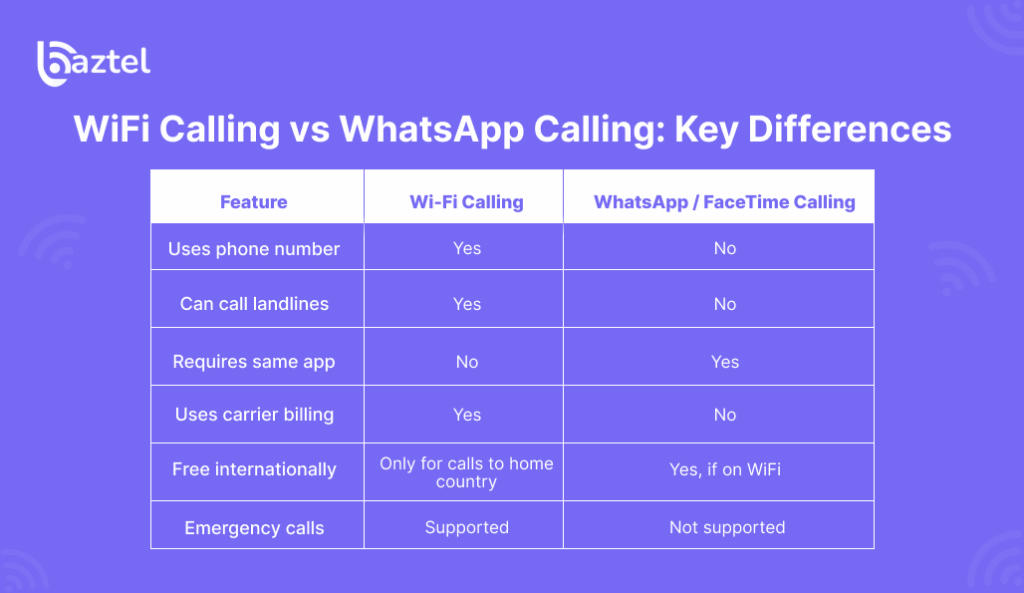 The table is a great visual representation of the main differences between WiFi Calling and traditional app-based calling services such as WhatsApp or FaceTime. WiFi Calling gets your usual phone number, encompasses landlines, and permits making emergency calls, yet it obeys the billing rules of your carrier. App-based calling is at no cost over WiFi and is available everywhere, but it requires both parties to have the same app installed, and it cannot connect to landlines or emergency services.